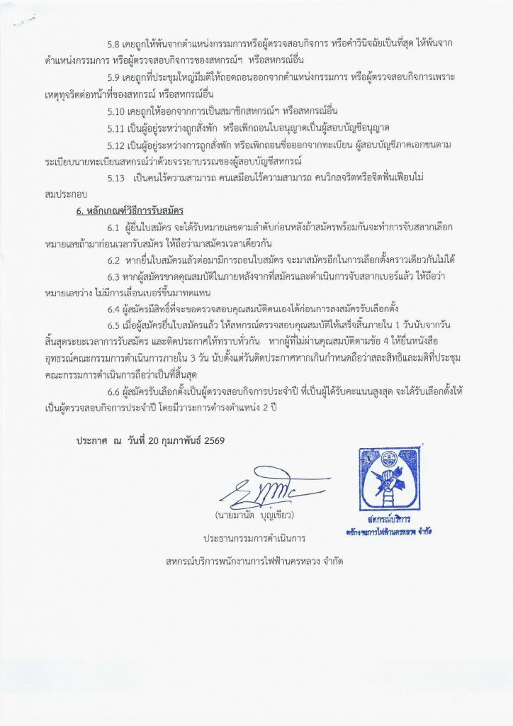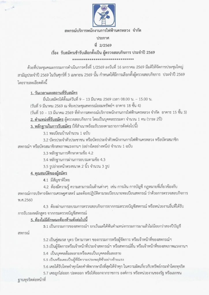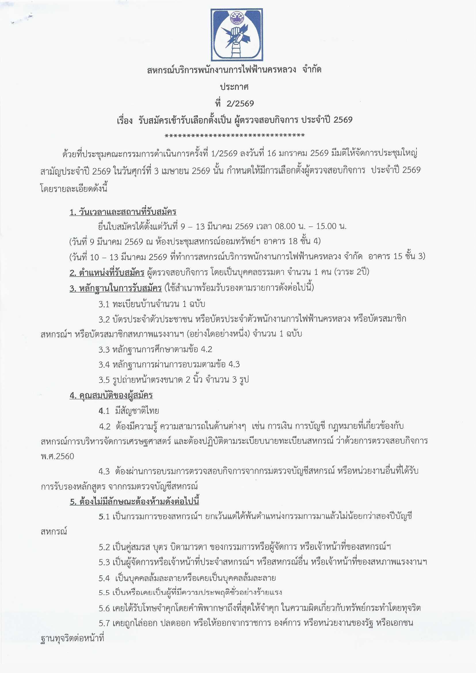 ประกาศที่ 2/2569 เรื่องรับสมัครเข้ารับการเลือกตั้งเป็น ผู้ตรวจสอบกิจการ ประจำปี 2569